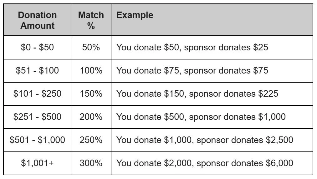Your generous donations will be matched by the event sponsor as follows if you would like to make your dollars go further: